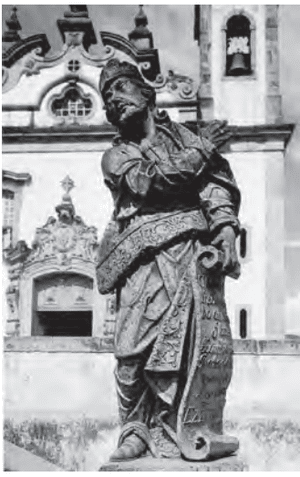 Com contornos assimétricos, riqueza de detalhes nas vestes e nas feições, a escultura barroca no Brasil tem forte influência do rococó europeu e está representada aqui por um dos profetas do pátio do Santuário do Bom Jesus de Matosinho, em Congonhas (MG), esculpido em pedra-sabão por Aleijadinho. Profundamente religiosa, sua obra revela: