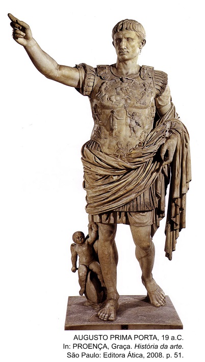 Augusto de Prima Porta foi o primeiro imperador romano. Essa escultura foi encontrada em 1863 em Prima Porta e esculpida em mármore. Nela, o imperador usa roupas militares e seu braço direito estendido constrói a imagem de orador que fala à sua tropa. Na perna direita, há um cupido montando um golfinho, sendo esse último um símbolo da vitória naval. Logo, a escultura transmite a ideia de poder e liderança do imperador.