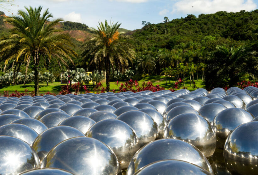 A instalação Jardim de Narcizo, de Yayoi Kusama, que fica no Inhotim, conta com 500 esferas de aço inoxidável que, ao flutuarem sobre um espelho d’água, refletem a natureza exuberante do lugar e o próprio espectador. A instalação é um tipo de arte experimental.