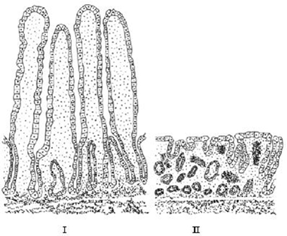Analise estas duas figuras, em que está representada uma região do intestino delgado em um indivíduo normal – I – e em um indivíduo com doença celíaca – II