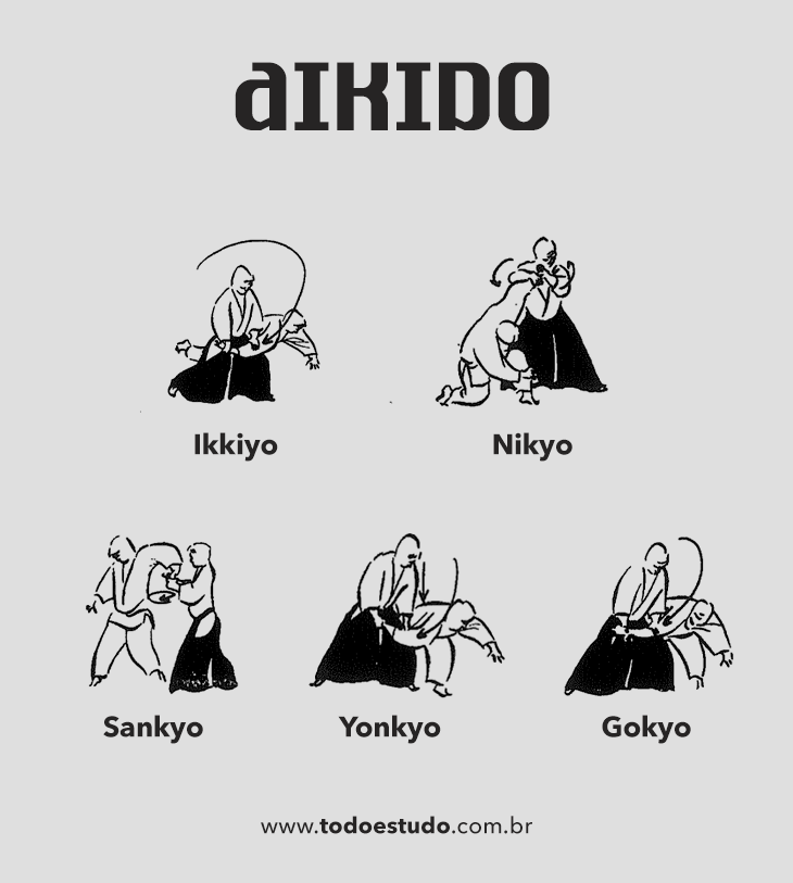 - Nikyo: segundo princípio de imobilização, essa movimentação consiste em uma técnica de torção aplicada no punho do uke, forçando-o a se ajoelhar e imobilizando sua ação.