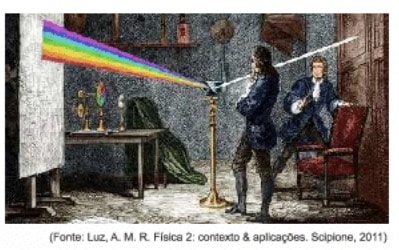Conta a história que Isaac Newton, trabalhando no polimento de algumas peças de vidro, conseguiu obter um prisma triangular, o qual utilizou para a sua famosa experiência de dispersão da luz branca, ilustrada na figura a seguir.
