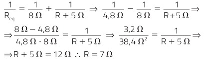 Ao analisar o circuito, é possível ver que os resistores em série tem os valores R e 5 Ω. Eles estão em paralelo com o resistor de 8 Ω. Assim: