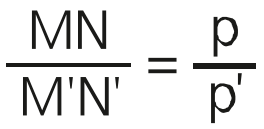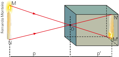 Colocando-se um objeto MN na frente do orifício, é possível gerar uma imagem M’N’ no fundo da câmara escura, sendo essa imagem invertida e menor que o objeto MN. Por conta da semelhança entre os triângulos MNO e M’N’O obtemos a seguinte equação: