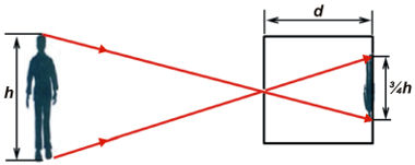 Graças ao princípio da propagação retilínea da luz, podemos chegar em uma equação para a câmara escura. Tomemos como exemplo um esquema de uma câmara escura a seguir.