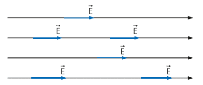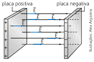 Quando uma região possui todos os campos elétricos na mesma direção, sentido e com o mesmo módulo, dizemos que esta região possui um campo elétrico uniforme. Isso pode ser observado na imagem acima. Um campo desse tipo pode ser gerado por duas placas paralelas carregadas com sinais contrários. A imagem a seguir mostra um exemplo disso.
