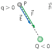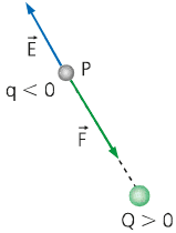 No caso em que a carga fonte é positiva (Q>0) e a carga de prova é negativa (q<0), o vetor campo elétrico possui mesma direção, mas em sentido contrário ao da força elétrica e aponta para fora, como pode ser visto na imagem a seguir.