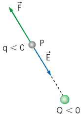 Quando tanto a carga Q como a carga q são negativas, o vetor campo elétrico tem a mesma direção do vetor força elétrica, mas em sentido contrário. A diferença deste caso para o anterior é que, aqui, o vetor campo elétrico aponta na direção da carga fonte.