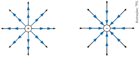 É possível observar que, dependendo do sinal da carga fonte – se ela é positiva ou negativa-, o vetor campo elétrico “sai” desta carga ou “entra” nela. Isto é conhecido como linhas de força de um campo elétrico gerado por uma carga. Desta forma, vamos entender agora o que são estas linhas de força.