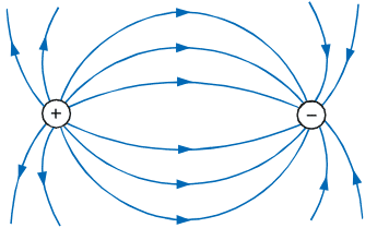Duas cargas de sinais opostos e de mesmo módulo: as linhas de força saem da carga positiva e entram na carga negativa.