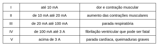 Nos choque elétricos, as correntes que fluem através do corpo humano podem causar danos biológicos que, de acordo com a intensidade da corrente, são classificados segundo a tabela abaixo.