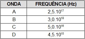 A tabela abaixo mostra as frequências para três tipos distintos de ondas eletromagnéticas, que irão atingir uma placa metálica cuja função trabalho corresponde a 4,5eV. A partir dos valores das frequências, podemos afirmar que: