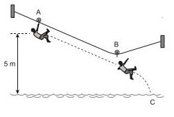 A figura ilustra um brinquedo oferecido por alguns parques, conhecido por tirolesa, no qual uma pessoa desce de determinada altura segurando-se em uma roldana apoiada numa corda tensionada. Em determinado ponto do percurso, a pessoa se solta e cai na água de um lago.