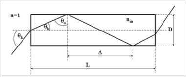 O princípio físico de funcionamento de uma fibra óptica está representado no esquema a seguir. Nele, o retângulo representa a fibra óptica e os segmentos de reta indicam um feixe de luz, que, a partir do ar no lado esquerdo da fibra, incide sobre sua extremidade, percorre seu interior e sai na extremidade direita.