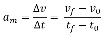 Além disso, é possível definir a aceleração como aceleração escalar média ou instantânea. A primeira é denominada como a variação da velocidade de um móvel em um determinado intervalo de tempo. A equação para a aceleração escalar média é: