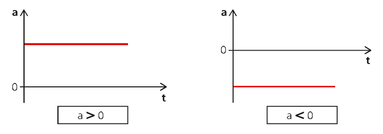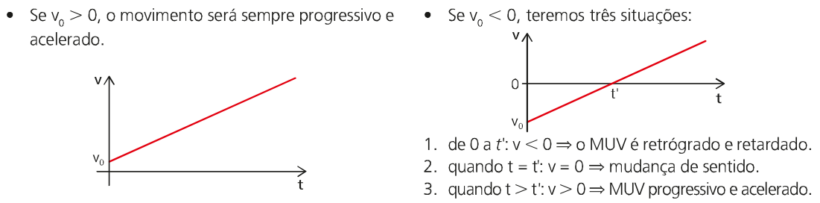 Uma reta é o que representa o gráfico de velocidade por tempo, pois a equação da velocidade em função do tempo é uma equação do primeiro grau. Se a aceleração for positiva (a > 0), v(t) será uma função crescente: