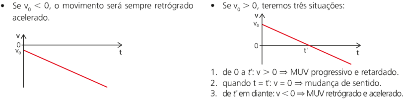 Agora, se a aceleração for negativa (a < 0), então a função da velocidade será uma função decrescente: