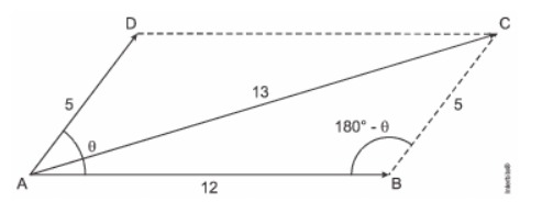 Aplicando a lei dos cossenos e sabendo que cos (180° – θ) = – cos θ, temos: