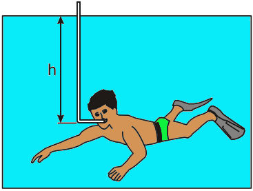 A diferença de pressão máxima que o pulmão de um ser humano pode gerar por inspiração é em torno de 0,1 x 105 . Pa ou 0,1 atm. Assim, mesmo com a ajuda de um snorkel (respiradouro), um mergulhador não pode ultrapassar uma profundidade máxima, já que a pressão sobre os pulmões aumenta à medida que ele mergulha mais fundo, impedindo-os de inflarem.