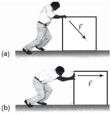 Uma pessoa arrasta uma caixa sobre uma superfície sem atrito de duas maneiras distintas, conforme mostram as figuras (a) e (b). Nas duas situações, o módulo da força exercida pela pessoa é igual e mantém-se constante ao longo de um mesmo deslocamento.