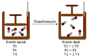 Trata-se de uma transformação isobárica, porque a pressão é constante. Assim, volume e temperatura, na escala kelvin, são diretamente proporcionais. Contudo, a temperatura em celsius não é diretamente proporcional ao volume. Dessa forma, se o volume dobra, a temperatura em kelvin também dobra.