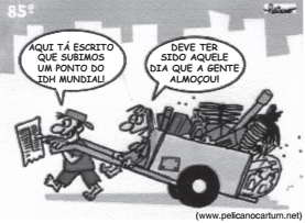 A charge ironiza uma das variáveis que compõem o cálculo do índice de Desenvolvimento Humano proposto pela organização das Nações Unidas, a saber,