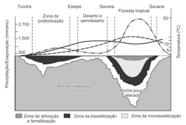 b) tropicais ocorre menor pluviosidade, o que se relaciona com a menor profundidade das rochas inalteradas.