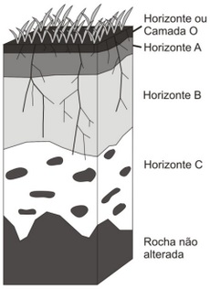 02. [UNICAMP]: Solo é a camada superior da superfície terrestre, onde se fixam as plantas, que dependem de seu suporte físico, água e nutrientes. Um perfil de solo é representado na figura abaixo. Sobre o perfil apresentado é correto afirmar que: