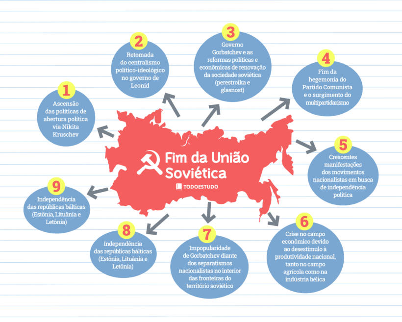 O fim declarado da União Soviética, em 1991, é considerado um marco na história contemporânea. Esse processo não ocorre repentinamente, muitos acontecimentos contribuíram para o rompimento final. Dentre eles, mudanças nos aspectos políticos, econômicos e, sobretudo, ideológicos.