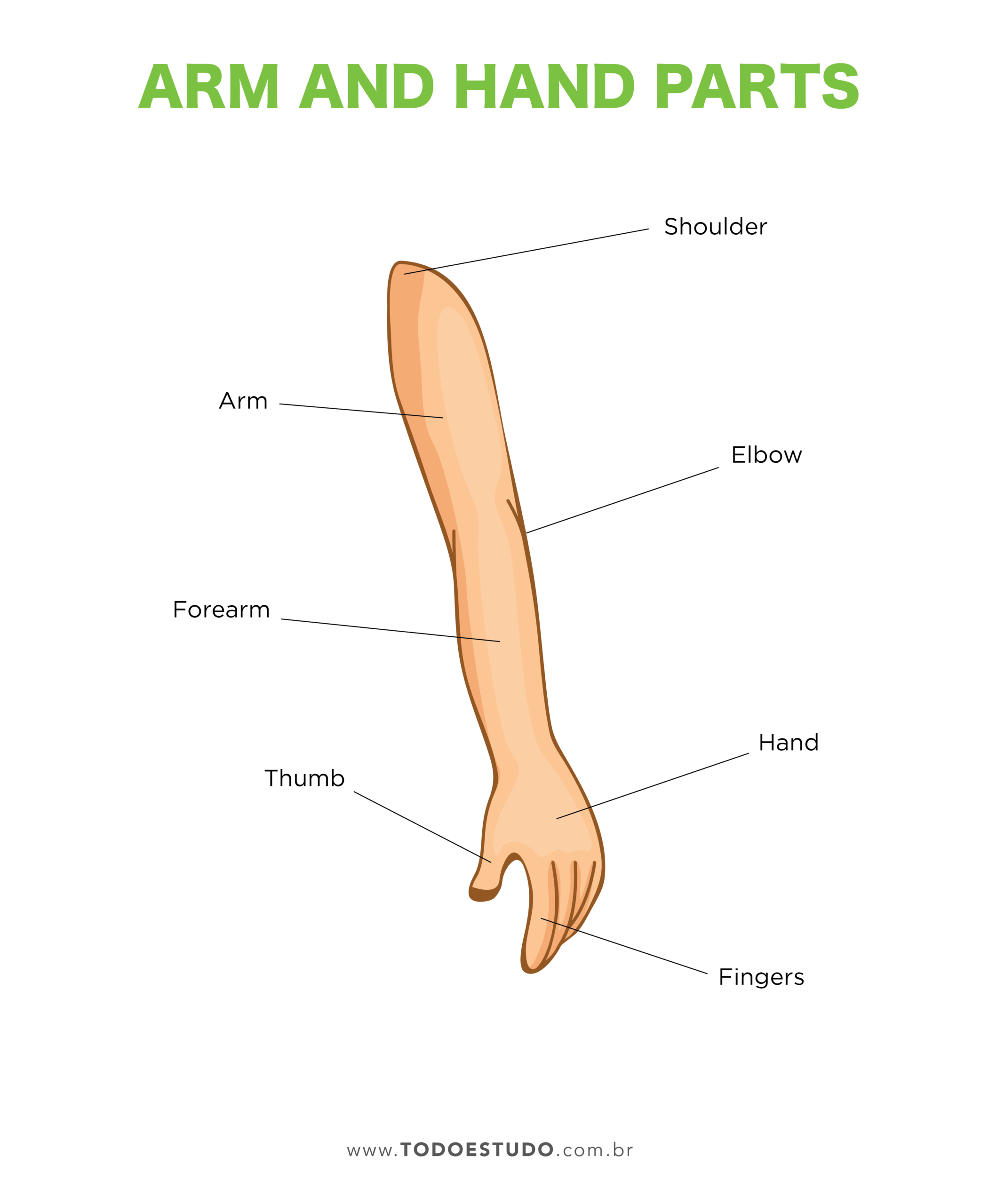 Continuando, têm-se as partes dos braços e das mãos. Em inglês, o polegar é separado dos outros dedos e chamado de thumb.