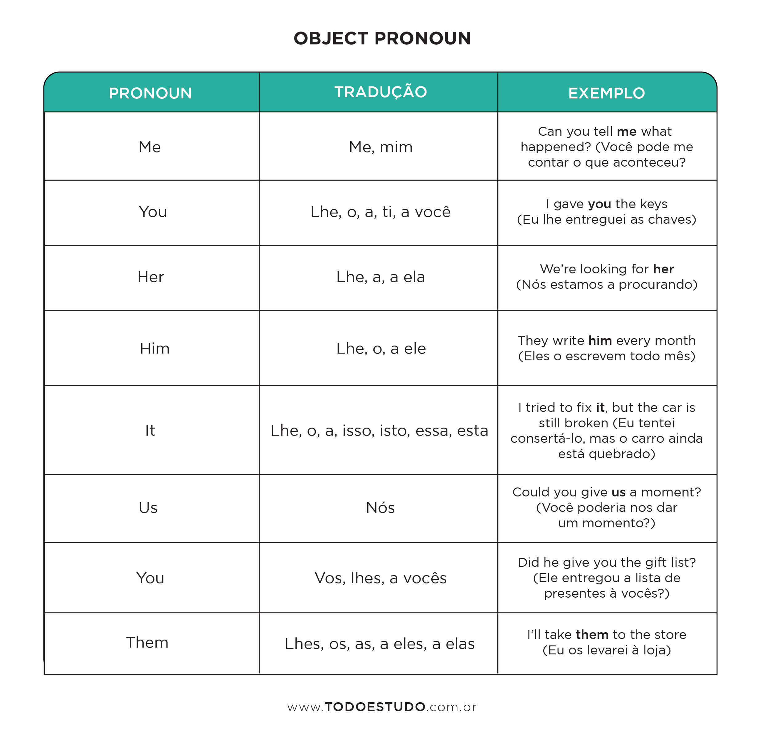 Já no caso do object pronouns, estas palavras se referem ao objeto da frase, ou seja, quem “recebe a ação” expressa pelo verbo.