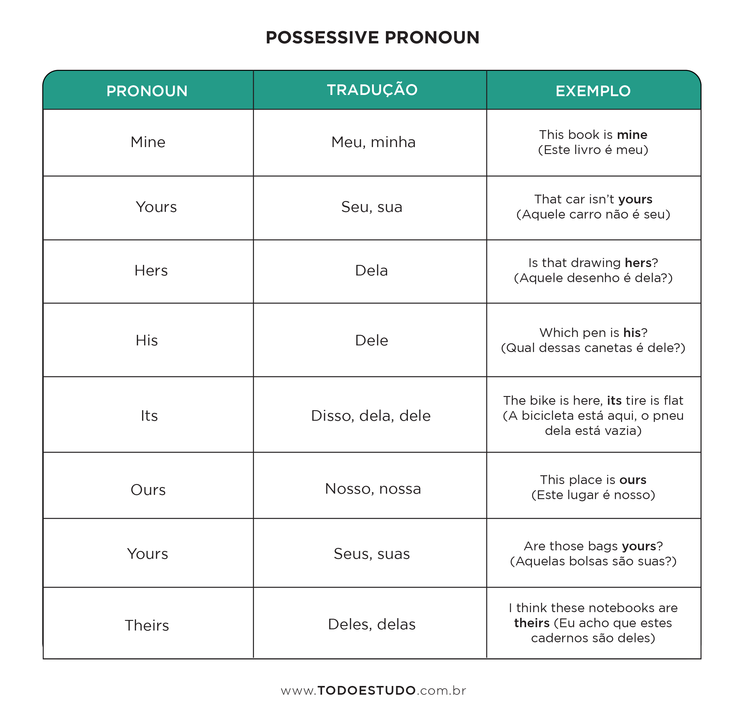 Como é possível notar na tabela, os possessive pronouns geralmente são usados ao final das frases, após a coisa que é possuída aparecer. Por exemplo: