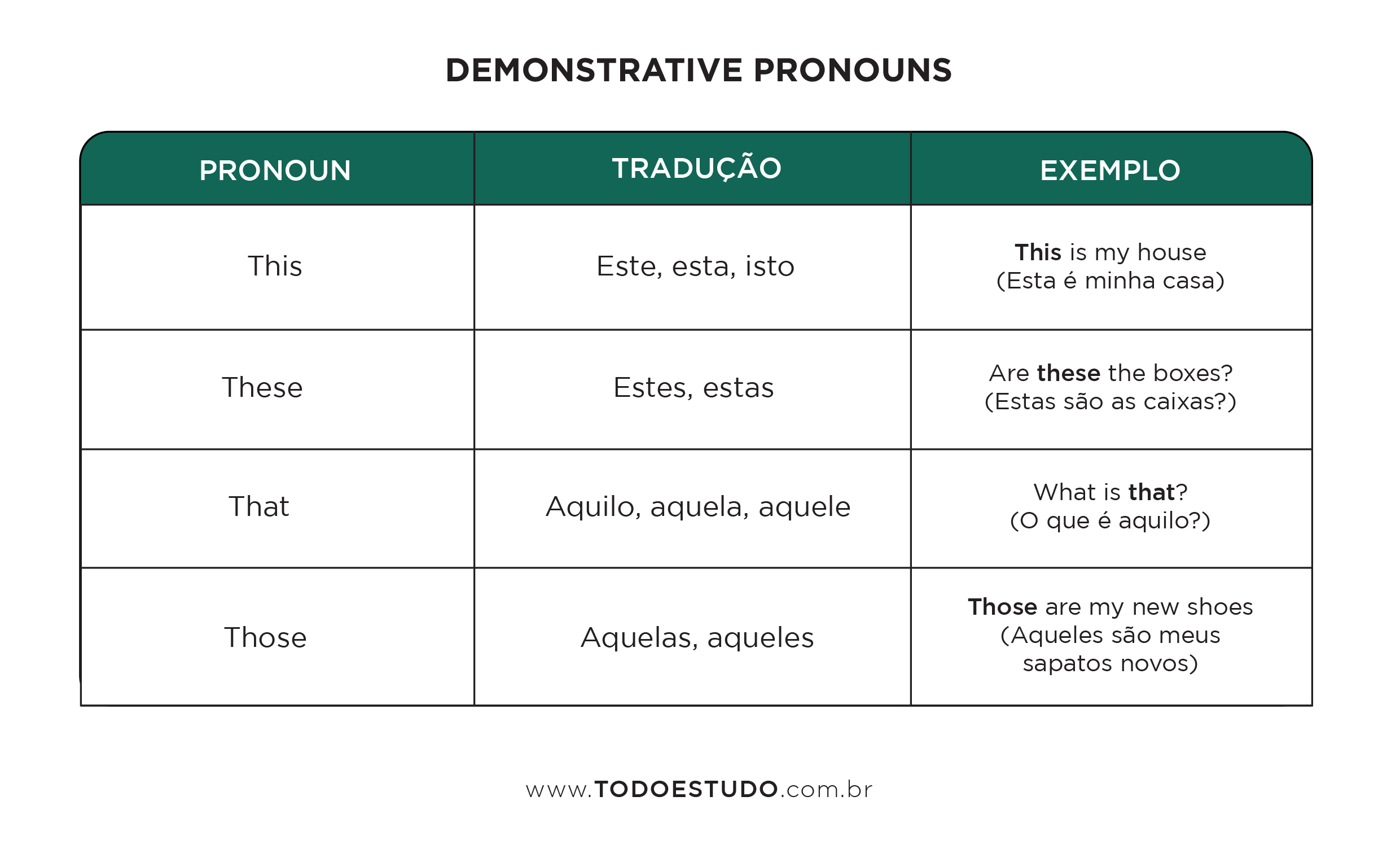 Estes pronomes são utilizados para apontar coisas ou pessoas em diferentes distâncias. Abaixo, Veja como são usados os demonstrative pronouns, que são this, these, that, those