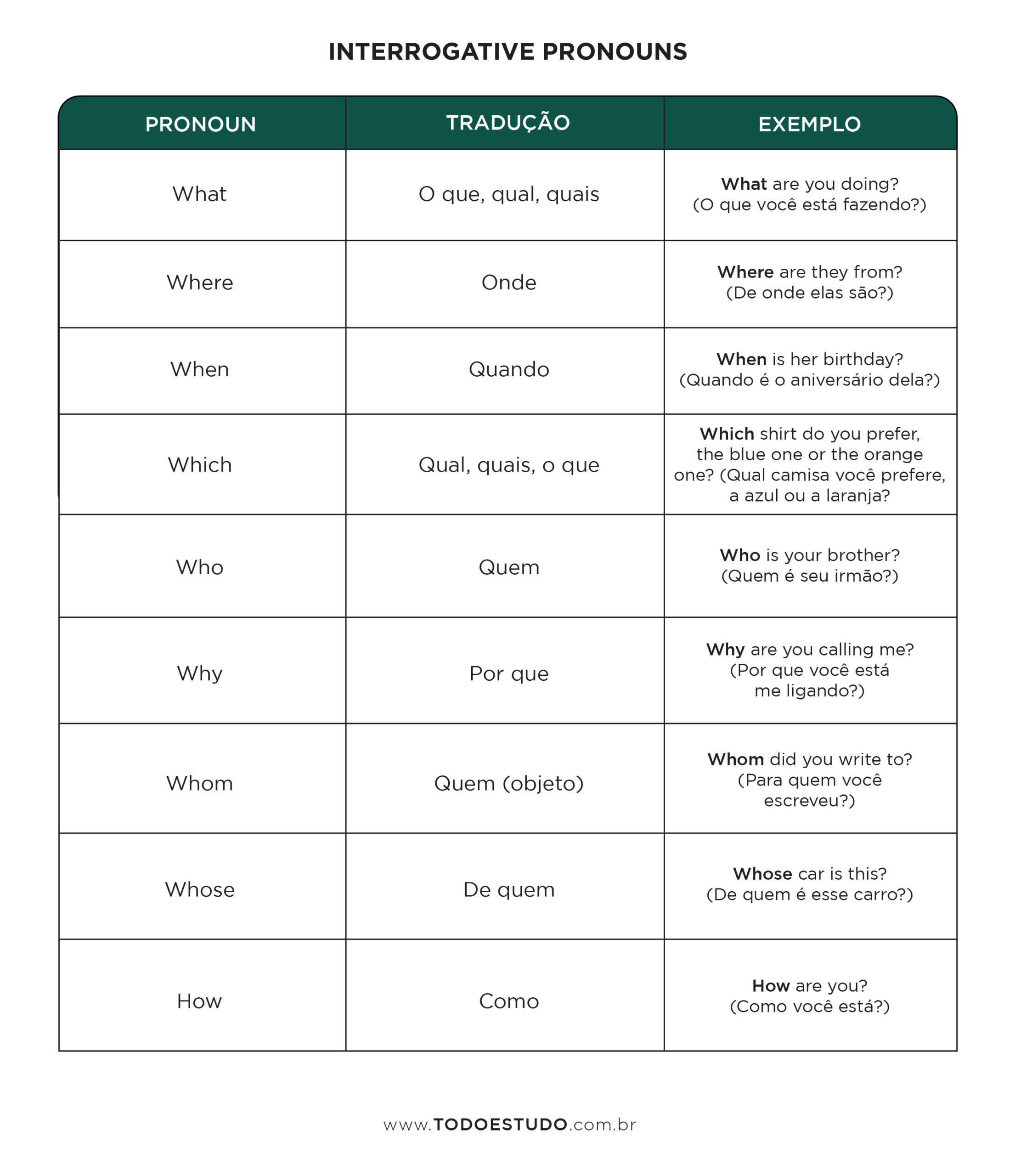 Ao considerar os interrogative pronouns, as palavras que se encaixam nesta classe introduzem e caracterizam perguntas comuns, tais como quando, onde, porque, quem, como etc.