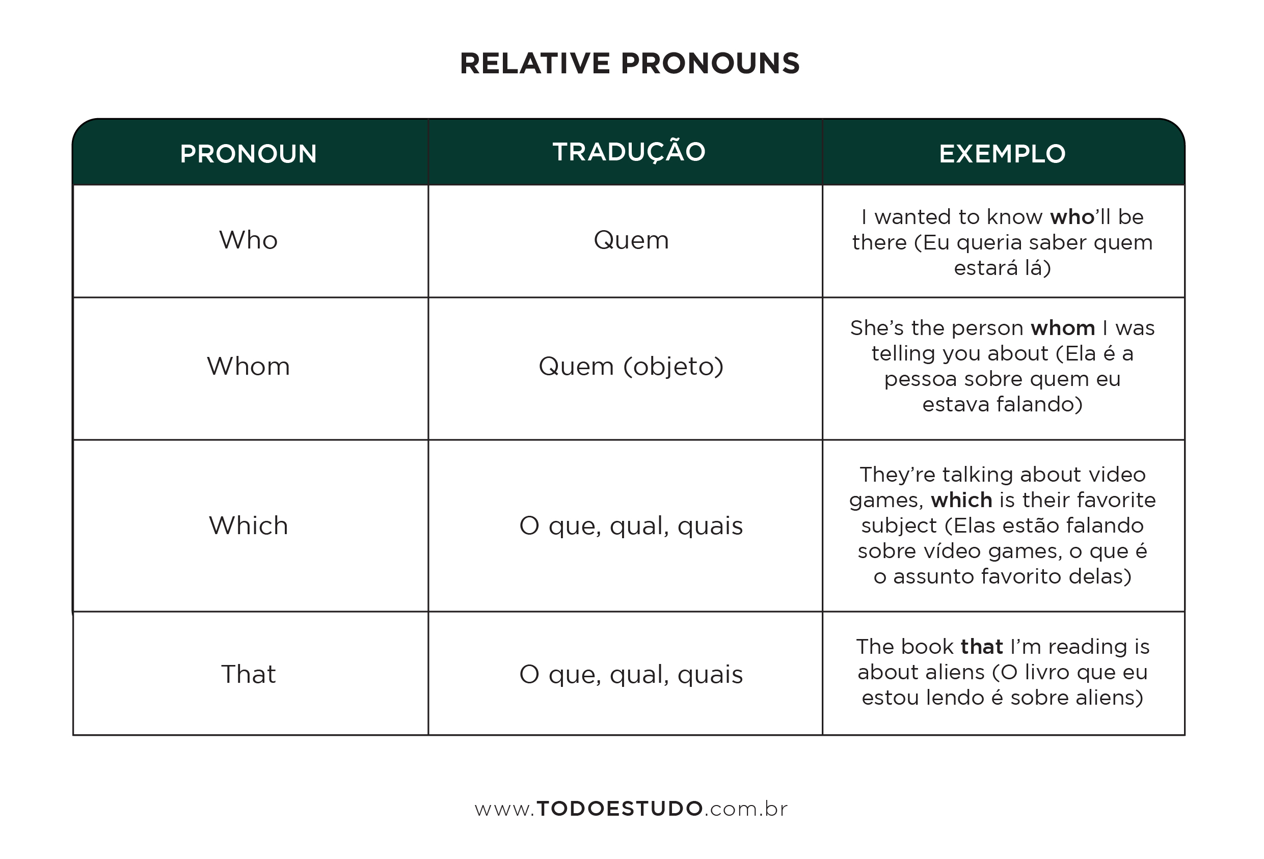 Como é possível notar na tabela, os relative pronouns são divididos entre função de sujeito (who, that, which) e objeto (whom, which, that). Além disso, who e whom são usados para pessoas, enquanto that e which são usados para objetos. Por exemplo: