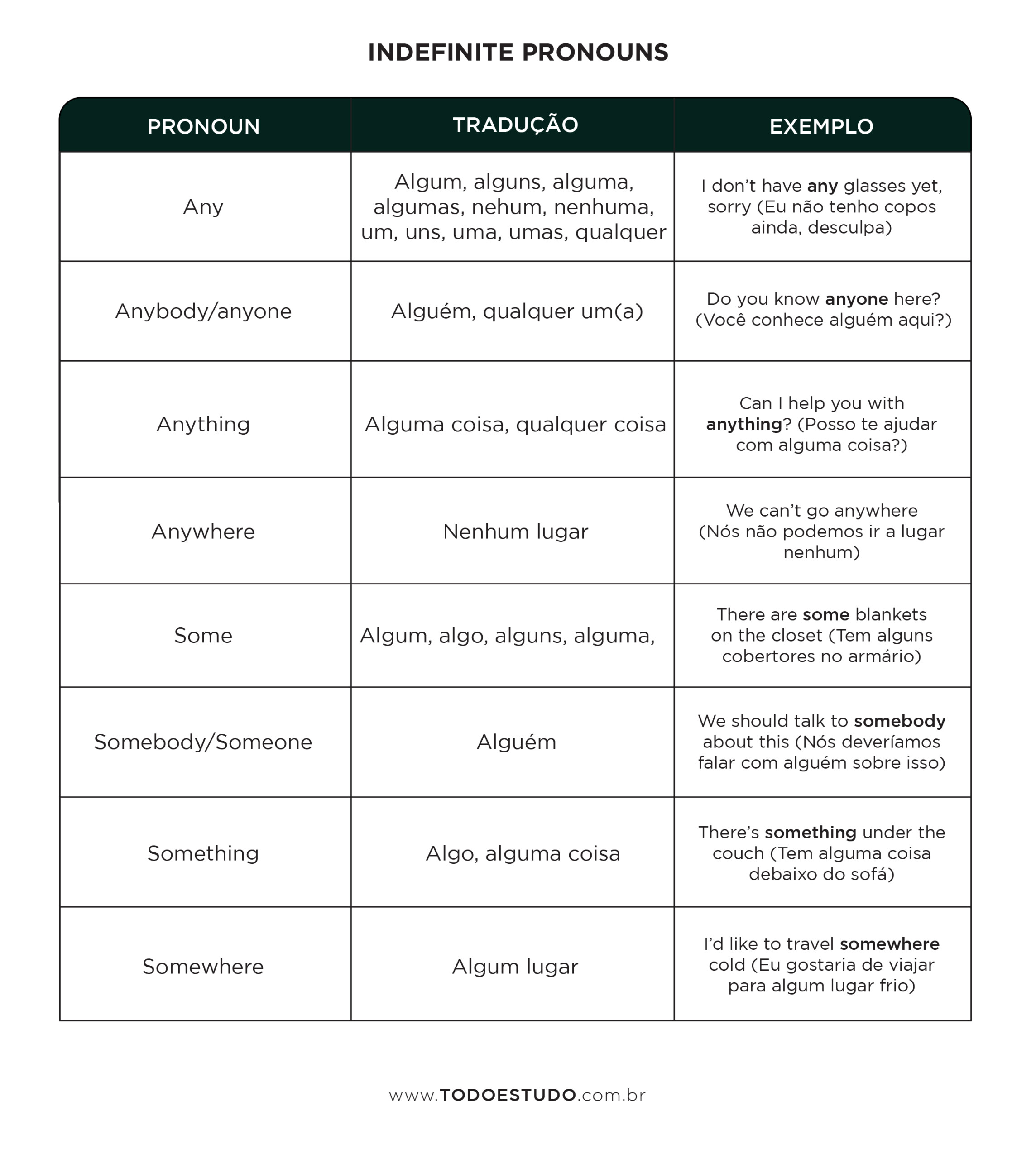 Indefinite pronouns são pronomes indefinidos, ou seja, diferentemente dos pronomes vistos até agora, eles não se referem a um sujeito específico.