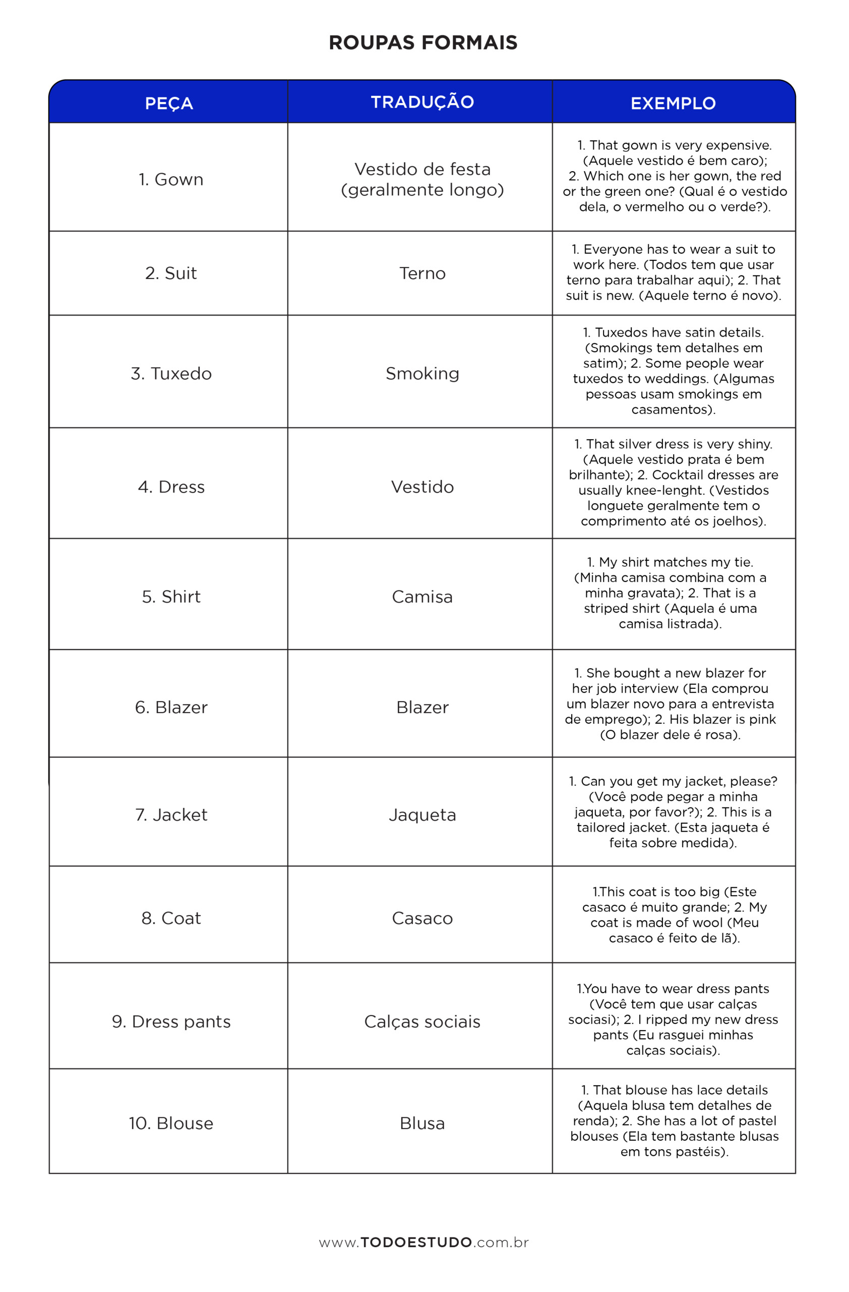 Roupas formais são usadas em ocasiões mais chiques e especiais, como festas, celebrações etc. Em inglês, elas são: