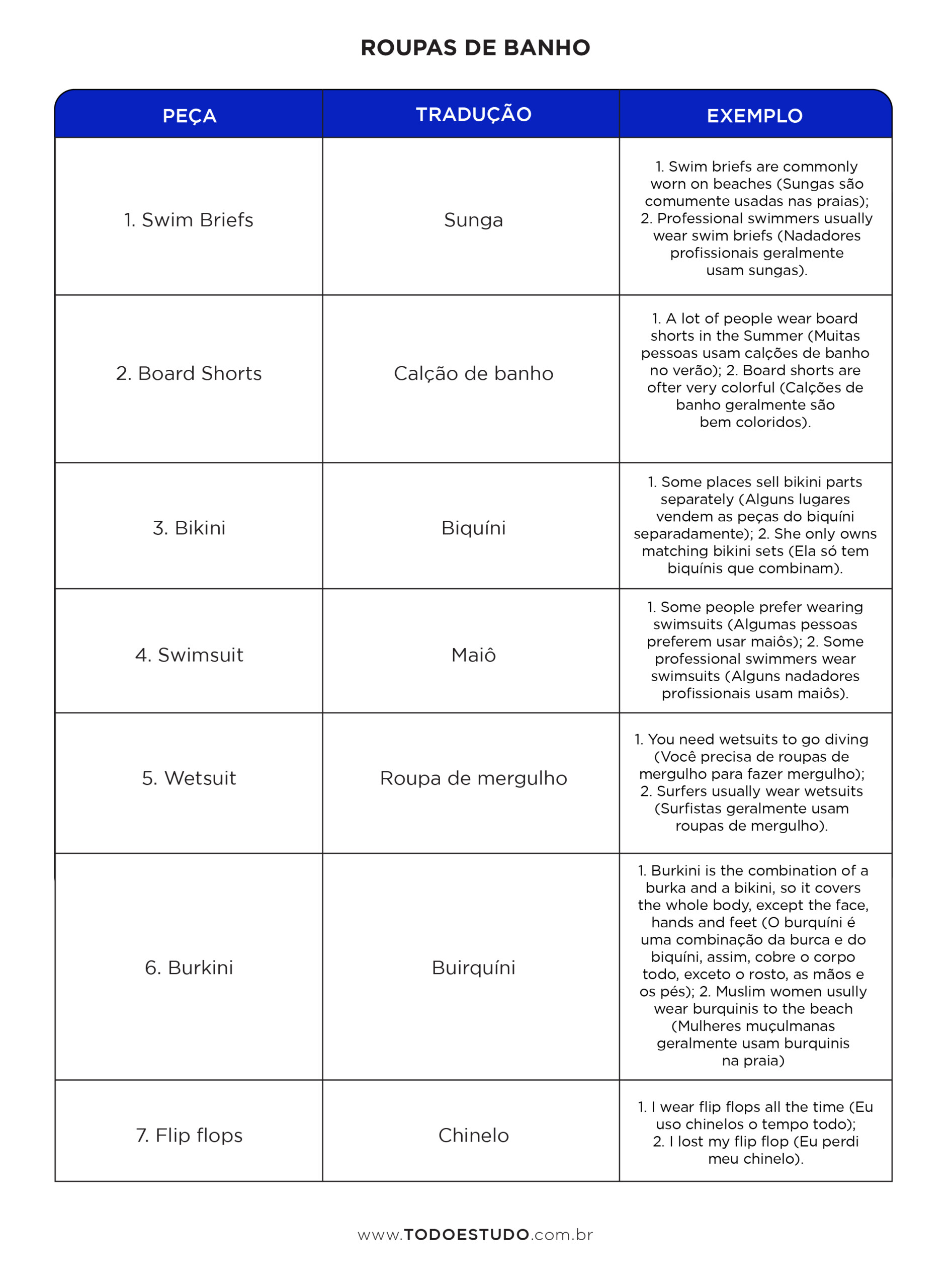 Roupas de banho são usadas para nadar, ou seja, na praia, na piscina etc. Veja as principais: