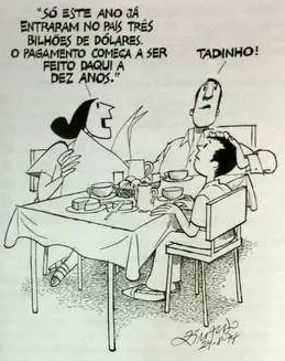 Justificativa: A charge tematiza a política econômica do regime militar brasileiro que realizou empréstimos internacionais gigantescos para serem pagos a longo prazo. Nesse sentido, a fala do pai é irônica, pois seria a geração de seu filho que acabaria pagando as dívidas feitas pelo governo naquele momento.