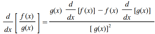 Ou seja, a derivada de um quociente é o denominador vezes a derivada do numerador menos o numerador vezes a derivada do denominador, todos divididos pelo quadrado do denominador.