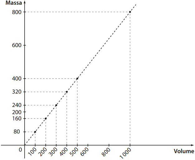 O gráfico acima representa um exemplo de função linear em que a massa e o volume de um determinado azeite variam proporcionalmente.