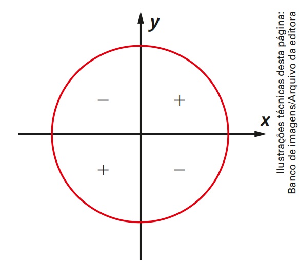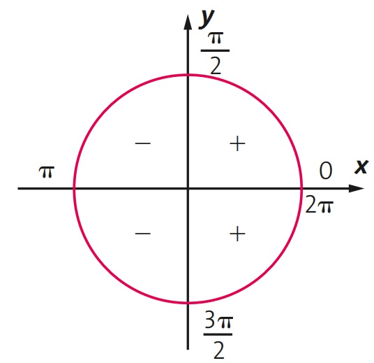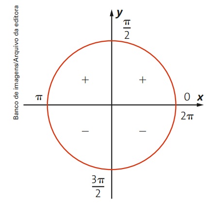 A função seno troca seu sinal (positivo ou negativo) dependendo da região onde está. Ela é positiva no 1° e no 2° quadrantes e negativa no 3° e no 4° quadrantes.