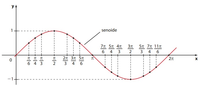 O gráfico da função seno recebe o nome de senoide. A imagem representa apenas um período da função seno, pois, como ela é periódica, essa representação se repetirá durante todo o domínio.