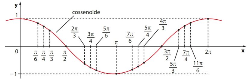 O gráfico da função cosseno, representado na figura anterior, é conhecido como cossenoide. Ele é quase idêntico ao gráfico da função seno, tendo apenas a diferença de estar defasado em π/2.
