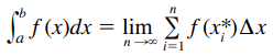Se f é uma função contínua definida em a≤x≤b, dividimos o intervalo [a, b] em n subintervalos de comprimentos iguais Δx=(b-a)/n. Sejam x0(=a), x1,x2, . . . , xn(=b) as extremidades desses subintervalos, escolhemos os pontos amostrais x*1 , x*2 , …, x*n nesses subintervalos, de forma que x*i esteja no i-ésimo subintervalo [xi-1, xi]. Então, a integral definida de f de a a b é