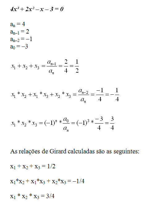 02. [ENEM] De acordo com a equação 4x³ + 2x² – x – 3 = 0, determine as relações de Girard envolvendo as raízes x1, x2 e x3.