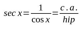 A secante é o inverso do cosseno. Como essa função é igual à razão do cateto adjacente pela hipotenusa, seu inverso será a hipotenusa dividida pelo cateto adjacente