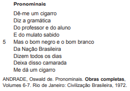 E) As expressões “Do professor e do aluno/ E do mulato sabido” (v. 3-4) exercem morfossintaticamente função de complemento nominal.