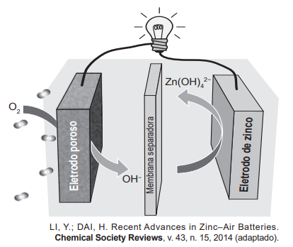Grupos de pesquisa em todo o mundo, vêm buscando soluções inovadoras, visando à produção de dispositivos para a geração de energia elétrica. Dentre eles, pode-se destacar as baterias de zinco-ar, que combinam o oxigênio atmosférico e o metal zinco em um eletrólito aquoso de caráter alcalino. O esquema de funcionamento da bateria zinco-ar está apresentado na figura.