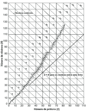 Os núcleos dos átomos são constituídos de prótons e nêutrons, sendo ambos os principais responsáveis pela sua massa. Nota-se que, na maioria dos núcleos, essas partículas não estão presentes na mesma proporção. O gráfico mostra a quantidade de nêutrons (N) em função da quantidade de prótons (Z) para os núcleos estáveis conhecidos.